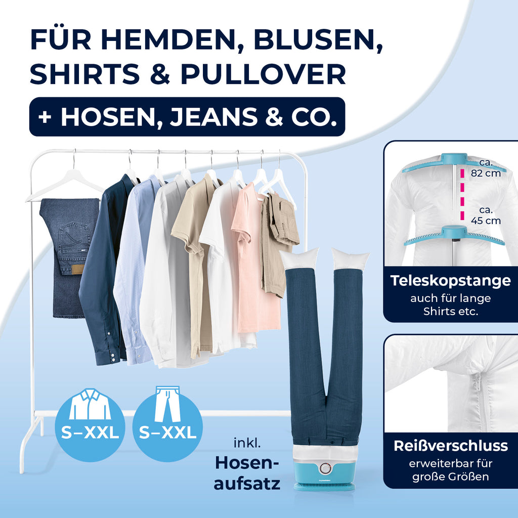 Der Hemdenbügler ist dank Teleskopstange und Reißverschluss einfach verlänger- und erweiterbar und somit für nahezu alle Größen und für viele Längen geeignet. Dazu ersetzt er Bügeleisen, Dampfglätter & Co. und schafft somit mehr Ordnung im Haushaltshelfer-Chaos. Vergiss mühsames und zeitfressendes Bügeln – der CLEANmaxx Hemdenbügler PRO mit Hosenaufsatz nimmt dir die Arbeit ab!