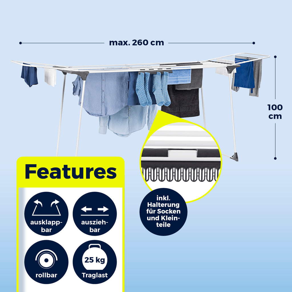 Der klappbare EASYmaxx Falt-Wäscheständer 2500 ist dein Begleiter, wenn es um schnelles & stromloses Trocknen deiner Wäsche geht. Dafür kommt der ausziehbare Allrounder mit Aufbaumaßen von ca. 200–260 x 56 x 100 cm daher & bietet dabei volle 25 Meter Gesamttrockenlänge sowie eine Traglast von max. 25 kg. So hast du ausreichend Platz, um 2–3 Waschladungen mit Hemden, Hosen sowie großen Wäschestücken wie Bettlaken & Handtüchern auf einmal zu trocknen. Ideal für Familien mit viel Wäsche!
