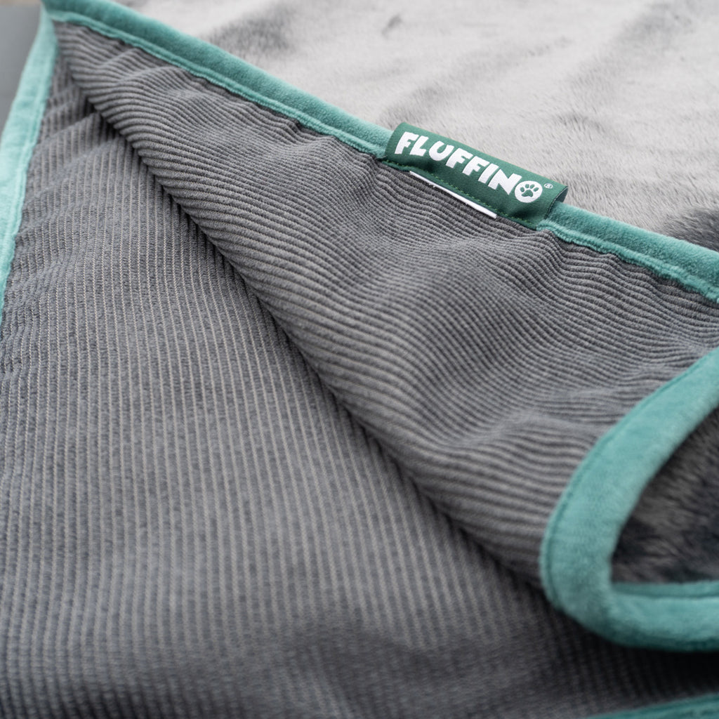 Das moderne Design der hochwertig verarbeitete Hundedecke wird vom schlichten Randmaterial aus türkisen Samt abgerundet.