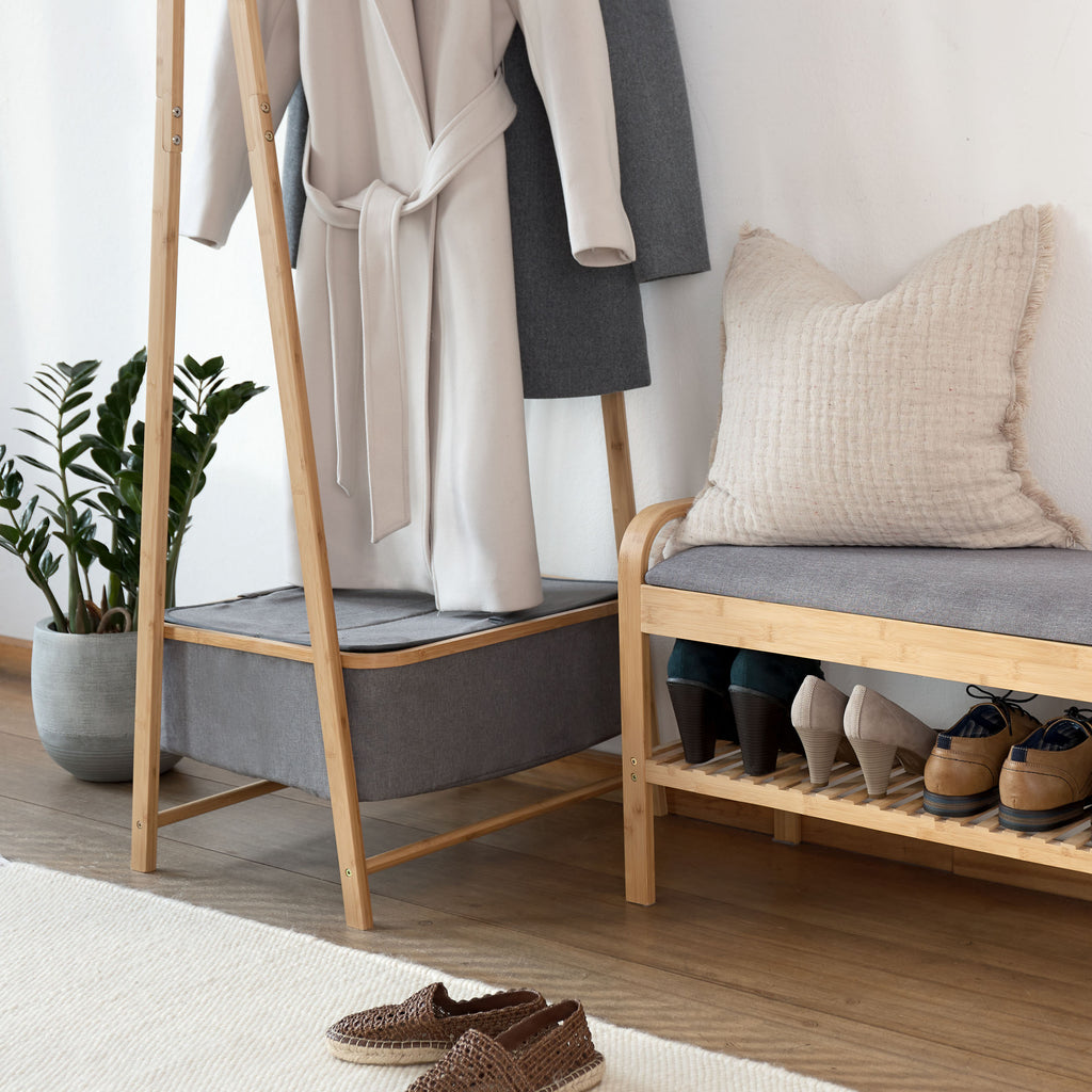 Sie erhalten den Kleiderständer in Beige oder Grau: Beide Farbvarianten fügen sich nahtlos in das Gesamtbild jeder Wohnung ein und setzen einen zeitlosen Akzent.