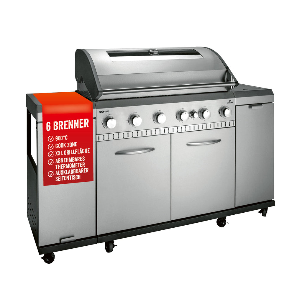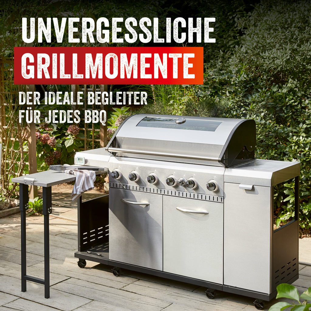 Und solltest du dich kurz um andere Dinge kümmern müssen, nimmst du den abnehmbaren Timer des Gasgrillwagens von LANDMANN zur optimalen Garzeitkontrolle einfach mit und hast selbst aus der Entfernung weiterhin alles im Blick. Das Gehäuse aus Deckel, Frontblenden und Türen besteht aus rostfreiem Edelstahl. Die Brenner kannst du über LED-Reglerknöpfe steuern und der ausklappbare Seitentisch bietet dir genau die Ablagefläche, die du für Grillbesteck, Saucen etc. benötigst.