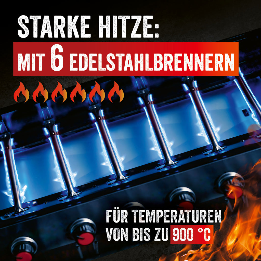 Einer für alles: Der hochwertiger Gasgrillwagen von LANDMANN mit 6 stufenlos einstellbaren Edelstahlbrennern bietet dir mit insgesamt 24 kW jede Menge Leistung und Flexibilität beim Grillen.