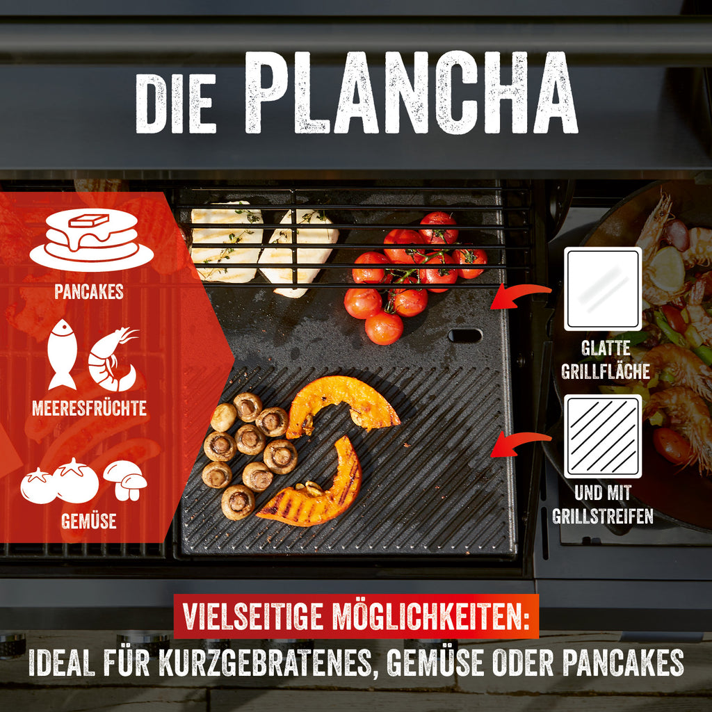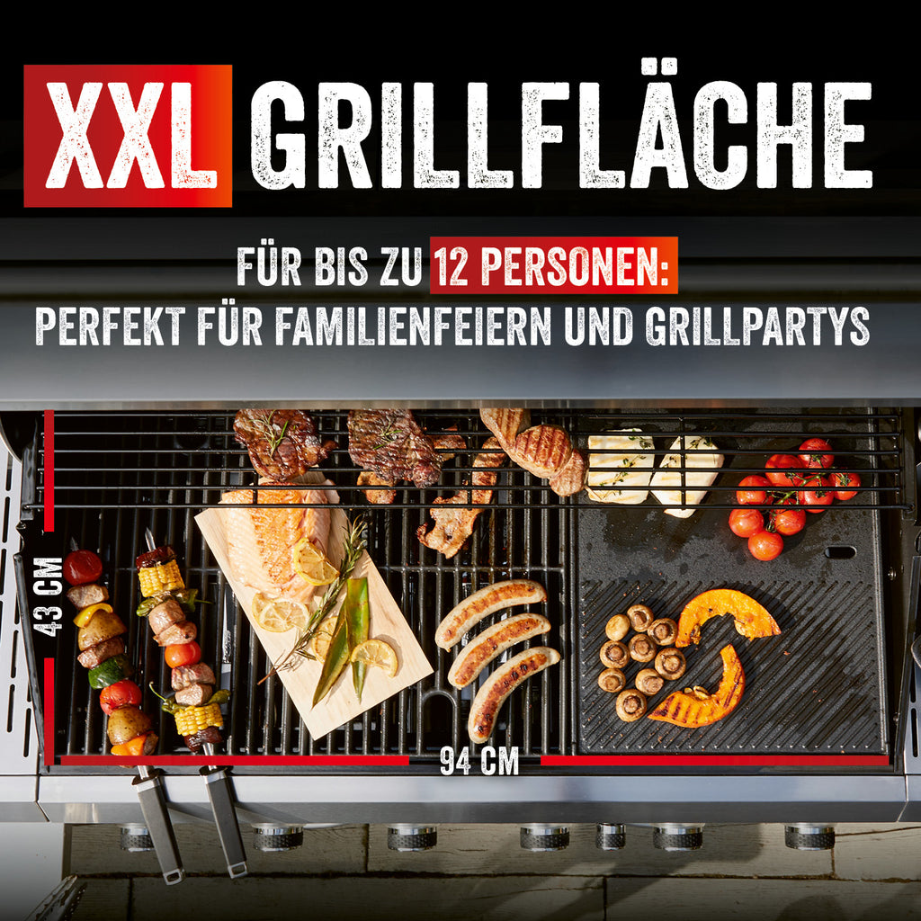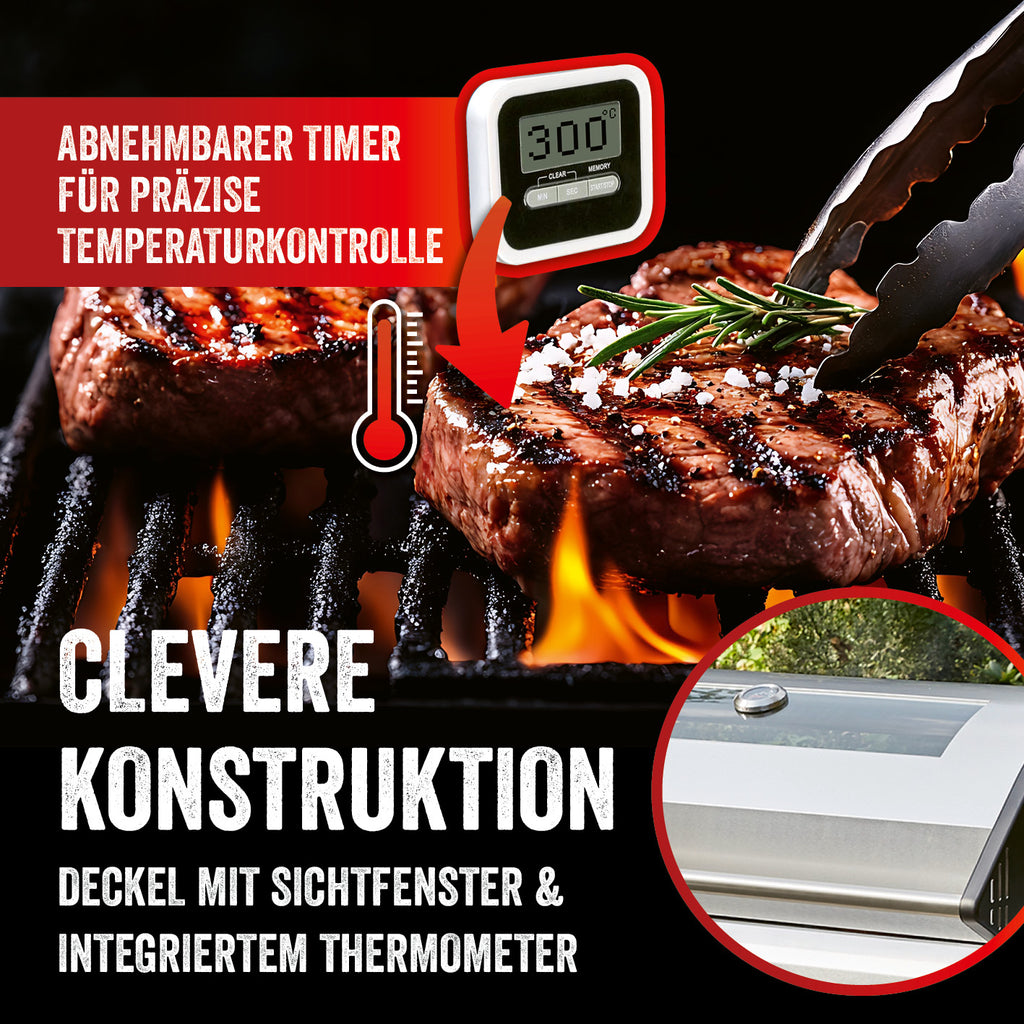 Auf dem separaten Seitenbrenner kannst du nicht nur die üblichen Grill-Beilagen, sondern z. B. auch ausgefallene Speisen im Wok zubereiten. Zusätzlich steht dir eine große Grillfläche von 94 x 43 cm zur Verfügung, die du ganz nach deinen Vorlieben belegen kannst. Sie ist mit zwei Grillrosten sowie einer Grillplatte aus emailliertem Gusseisen ausgestattet und daher angenehm leicht zu reinigen. Das große Sichtfenster aus Glas und das Thermometer im Deckel geben dir jederzeit den perfekten Überblick über dein Grillgut.