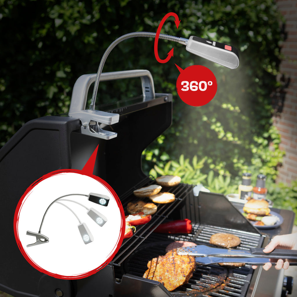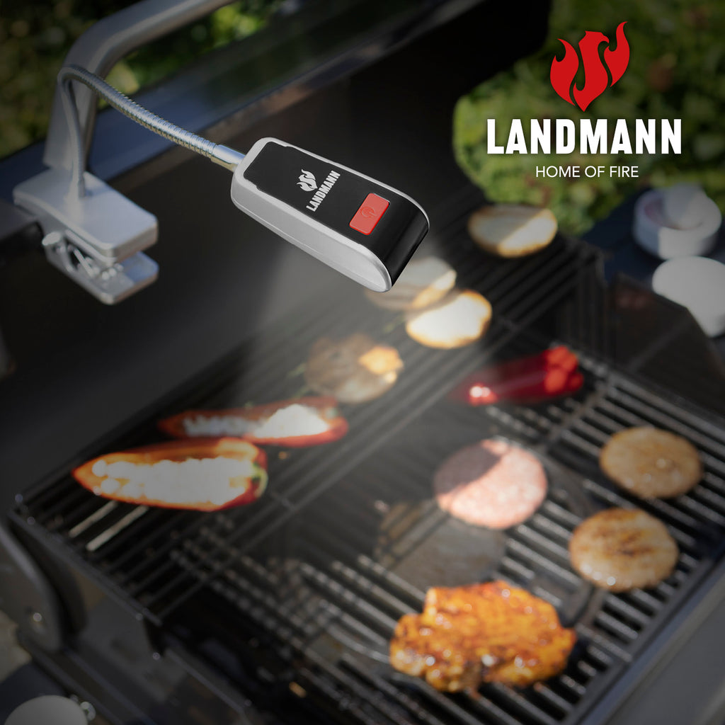 Die Grilllampe von LANDMANN lässt den Griller mit ihren 9 LEDs auch zu später Stunde nicht im Dunkeln stehen. Dank stromsparender LED-Technologie kannst du die Grillbeleuchtung unabhängig vom Stromnetz mit Batterien betreiben. Mit der Clipbefestigung lässt sie sich problemlos horizontal oder vertikal an den Grill klemmen. Grilllicht mit zusätzlicher Schraubbefestigung. Die benötigten 3 x AAA 1,5V Batterien sind im Lieferumfang nicht enthalten.