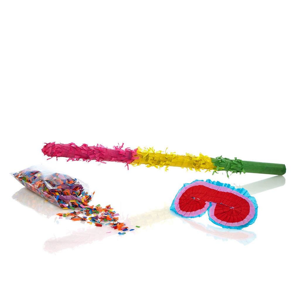 Im Set enthalten sind: 1 Regenbogen-Einhorn Pinata, 1 Schläger ca. 50 cm zum Zerschlagen der Pinata, 1 Augenmaske, 50 Gramm Konfetti.