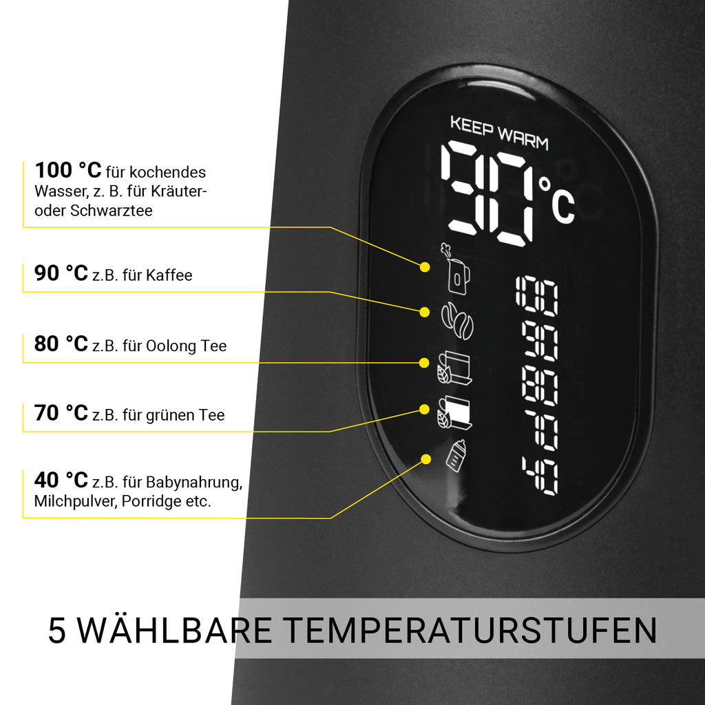 Genießen Sie mit dem digitalen Wasserkocher mit Temperatureinstellung von N8WERK Ihr Heißgetränk genau in der richtigen Temperatur. Mit einer integrierten Digitalanzeige im Gehäuse, auf der die Wassertemperatur in Echtzeit abzulesen ist, bietet der Wasserkocher fünf verschiedene Temperatureinstellungen von 40 °C bis 100 °C. Die doppelwandige Konstruktion mit Edelstahl im Inneren hält innen die Wärme, während die Außenseite kühl bleibt - für Ihre Sicherheit.