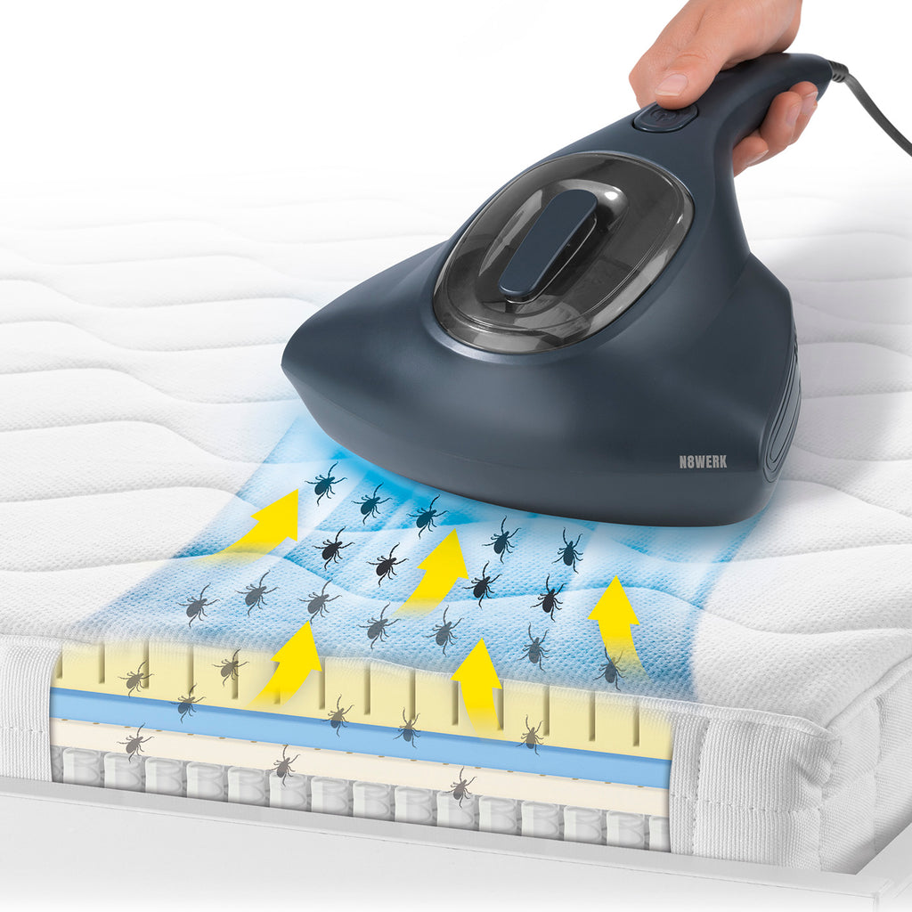 Hausstaub-Allergiker können ab sofort aufatmen und sich besser fühlen. Der N8WERK Milben-Handstaubsauger in der Nordic Night Edition befreit Betten, Matratzen, Kopfkissen und Polstermöbel von Staub und Verunreinigungen und sterilisiert gleichzeitig die Oberfläche durch UV-C-Licht. Zwei Schritte in nur einem Arbeitsgang - ohne Chemie.