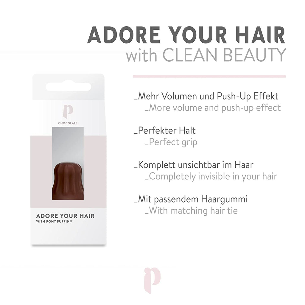 Das Schokobraun ist für alle Brünetten – von hell bis dunkel – die beste Wahl. Der kleine Helfer ist nach dem Einbinden völlig unsichtbar – den PONY PUFFIN einfach unter das Haar stecken und mit einem Haargummi fixieren. So liegt der Fokus allein auf deinem tollen Hairstyle – klingt verlockend, oder?