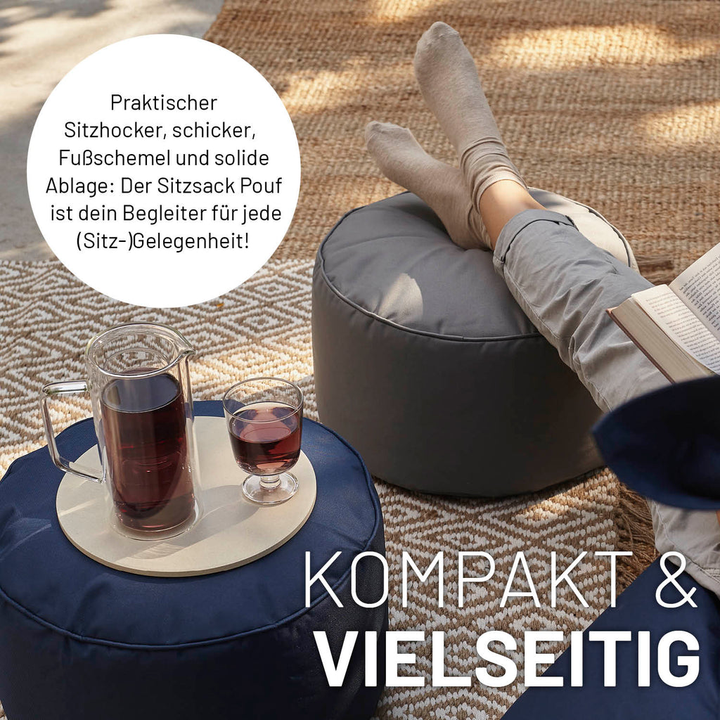 Praktischer Sitzhocker, schicker Fußschemel und solide Ablagefläche in einem kleinen Möbelstück! Auf dem kompakten Sitzsack Pouf lässt du sitzend die Seele baumeln, stellst darauf ab, was du in deiner Nähe wissen möchtest, oder legst einfach mal entspannt die Füße hoch. Entdecke die hochwertigen Materialien des kleinen Funktionswunders sowie das wasserabweisende, anschmiegsame & abwischbare Äußere – für bequemes, hygienisches Relaxen drinnen und draußen. Doch auch das Innere hat es in sich: Denn unsere EPS-Füllung ist zu 100 % made in Germany!